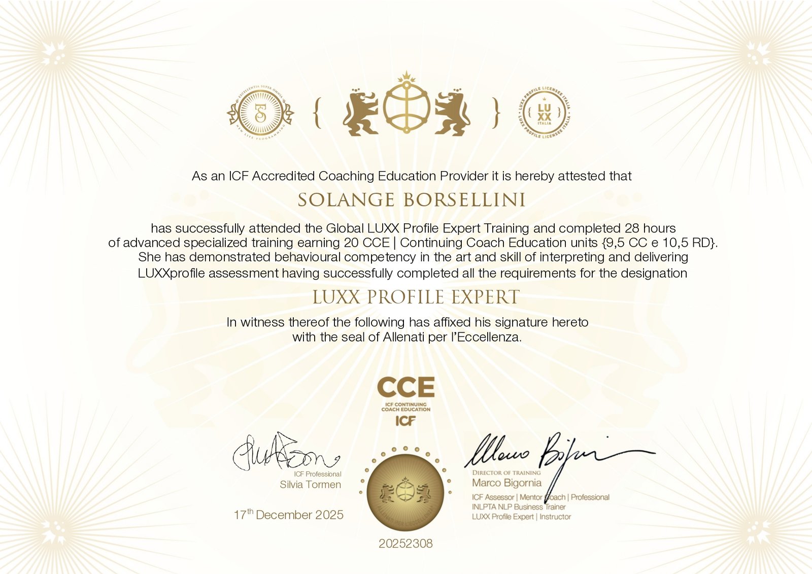 Sono un Coach Professionista con credenziale ACC diICF (la più antica associazione di coaching professionale al mondo). Possiedo il diploma in Programmazione Neurolinguistica, riconosciuto da INLPTA e sono un Luxx Profile Expert. Accompagno l’individuo nel perseguimento dei propri obiettivi personali e professionali, integrando nei percorsi di coaching, laddove utile, strumenti di PNL e di assessment come il LUXX Profile, per favorire consapevolezza, chiarezza e azione efficace.