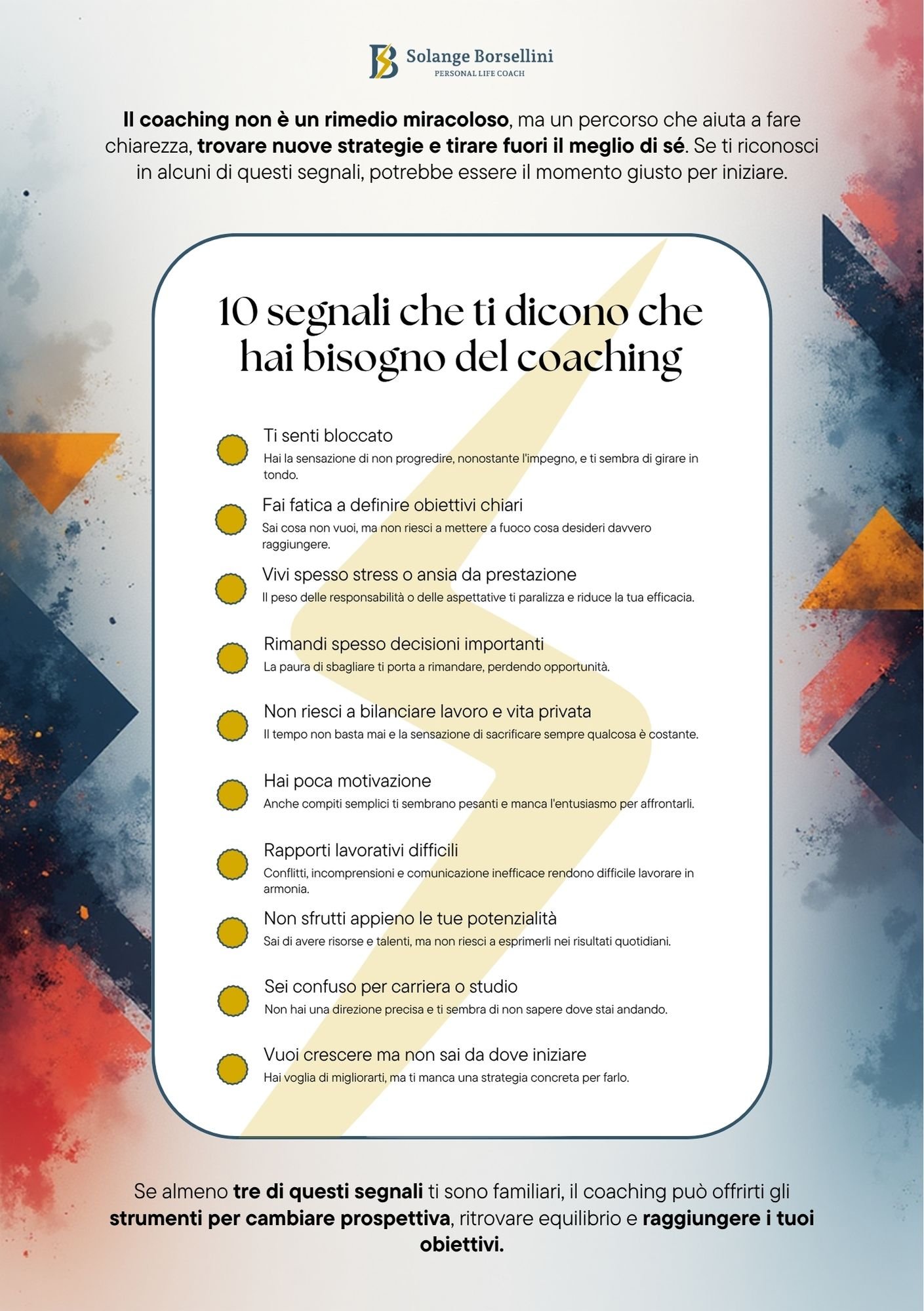 Forse ti stai chiedendo: “Come faccio a sapere se anche io ho bisogno del coaching?”. Per rispondere a questa domanda ho preparato per te una checklist gratuita con i 10 segnali più comuni che indicano che è il momento di iniziare un percorso di coaching.